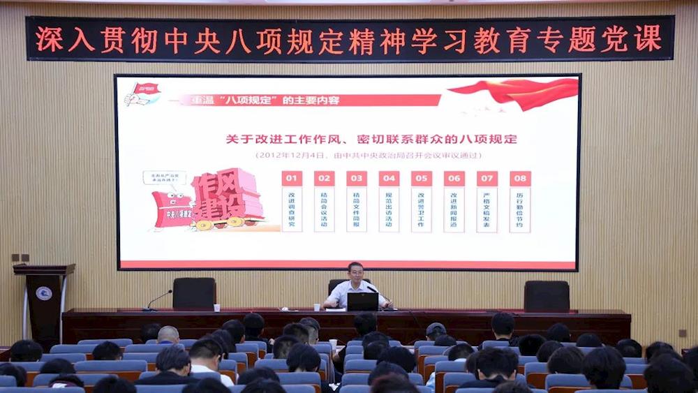 公司党总支副书记,教师党支部书记董文亮以《八项规定精神改变中国》为题,为公司党总支师生党员讲专题党课。